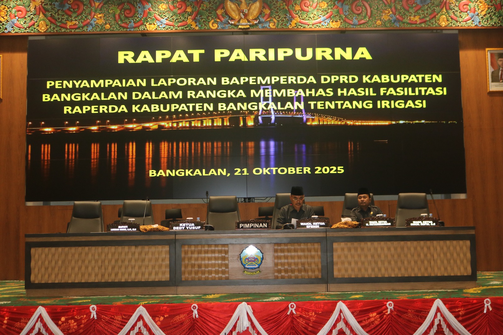 WAKIL Ketua I DPRD Kabupaten Bangkalan, H. Fatkhurrahman, menegaskan bahwa pembahasan hasil fasilitasi Raperda tentang Irigasi merupakan langkah penting dalam memperkuat kebijakan pengelolaan sumber daya air di daerah. Hal tersebut disampaikannya saat memimpin Rapat Paripurna Penyampaian Laporan Bapemperda DPRD Bangkalan, Selasa (21/10/2025).