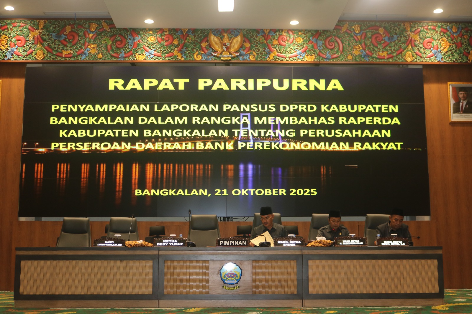 DEWAN Perwakilan Rakyat Daerah (DPRD) Kabupaten Bangkalan menggelar Rapat Paripurna dengan agenda penyampaian laporan Panitia Khusus (Pansus) terkait Rancangan Peraturan Daerah (Raperda) tentang Perusahaan Perseroan Daerah Bank Perekonomian Rakyat (BPR), Selasa (21/10/2025).